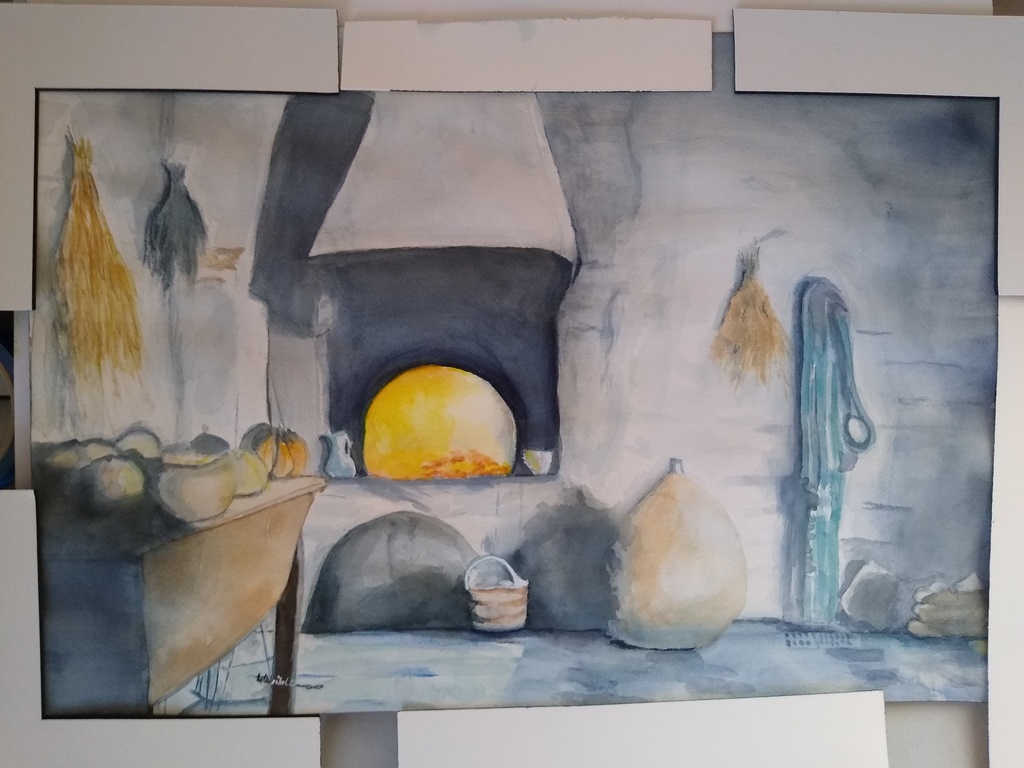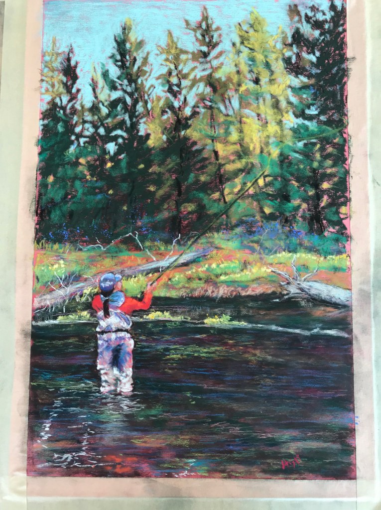 KImmer’s Fly Fisher – Pastels on Sanded PaperTerri’s French Farmhouse Kitchen – WatercolourElaine’s Horse Sculpture – Papier MacheBonnie Markland My surface medium is acrylic, then I repurpose in this case, lots of paint scum to create branch and background texture.”) pretty clever. Libby’s acrylic pour done with Amy at Creationes. she says she’s so pleased with it, she’s gonna keep it for herself! We don’t blame her a bit!