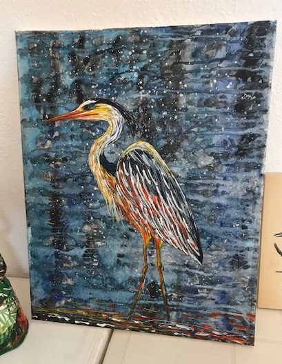 Lorraine played with dribbling and spattering the background and it spoke to her that the Heron should be in the foreground. Nice!
