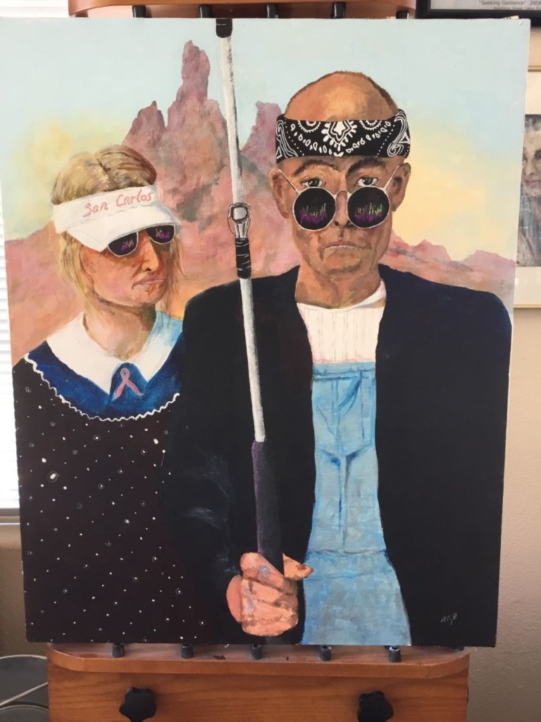Kimmer chose to do her take on American Gothic, a 1930 painting by Grant Wood, that she entitled Sonoran Gothic (pickleball and fishing!). Many saw this at the Christmas Boutique held this past weekend as she was marketing her painting on T-shirts and Card packs. As we often see with Kimmer’s work, you can spend hours just roaming the painting for all the little details! Awesome!