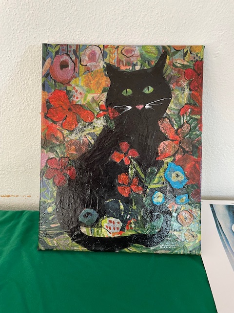 Elaine did her project using her love for collage and painting to create her representation of Cat in the flowers! Can’t remember the name of the Master she was emulating… But a very lovely rendition!