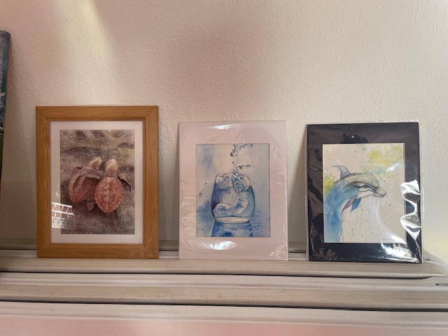 A trio of Lynn’s most recent watercolors. Love the turtles, the water and ice cubes look drinkable and the Dolphin utilizes Lynn’s signature detail along with loosening it up as well!