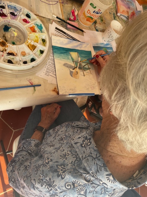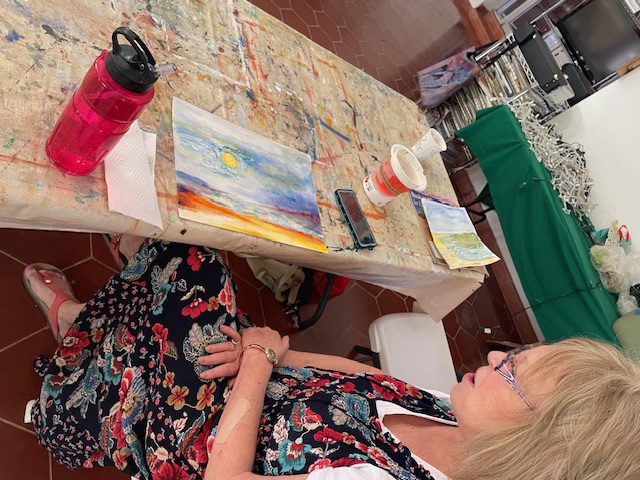 Lynn working on a great beach scene. She used a bar of soap to create an unusual resist in the sand area. Can’t wait to see this one completed!