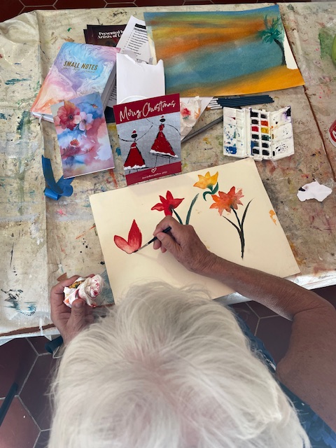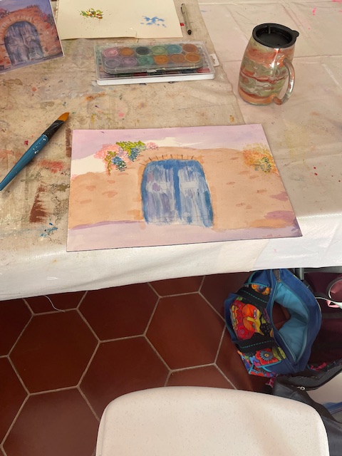 Watercolors in progress, Lisa’s mess on the left and Brenda’s lovely flowers on the right!