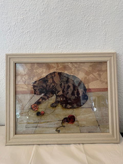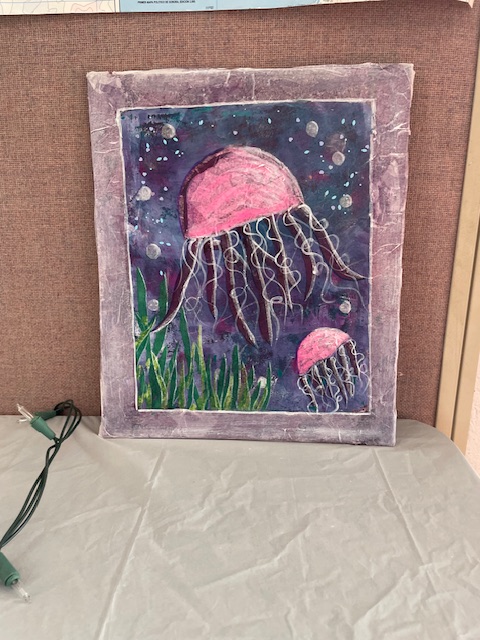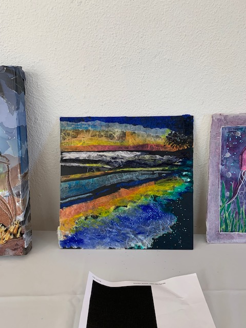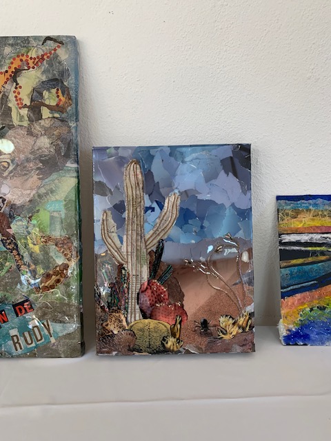 These are Kimmer’s collages. The octopus is what she worked on in December and the cactus was from a workshop we did with Constance last season. Kimmer faced some struggles with the octopus when she sealed it with resin, and finally concluded that the oil painting underneath was the culprit, as it took four resin pours before she got it to cure. Glad she was able to save this fabulous piece!