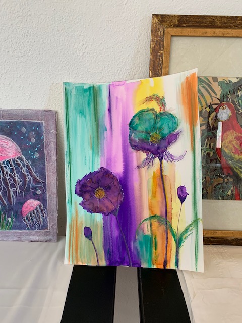 After we reviewed the collages from a couple weeks ago we had a few other pieces to see. Irene did this of the Petunias that sit on her porch. A few things were discussed about her painting, which the background btw was a paint pour she didn’t like, to help it be grounded and delineate the petunias a bit better. Irene said there was no light source so it was difficult to paint them with a light source direction. Great job Irene!