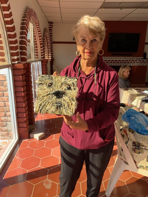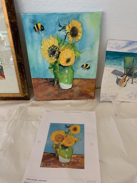 Cindy rejoined us this meeting for the season. Here is her interpretation of Van Gogh’s Sunflowers, love the bees! Great work Cindy!