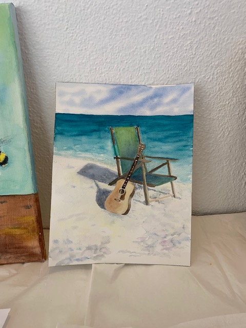 Lynn’s finished watercolour, too bad the beach is so chilly right now, makes us want to go! Lynn used bar soap as a resist to create the mottled sand. Great job and wonderful detail as only Lynn can do!