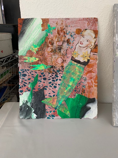 Jan brought her collage from a couple weeks ago, she was looking for input as to whether to put scales on the mermaid tail, and a few ideas were discussed so she could try scales without adding them permanently until she found the solution that she liked. Great job so far!