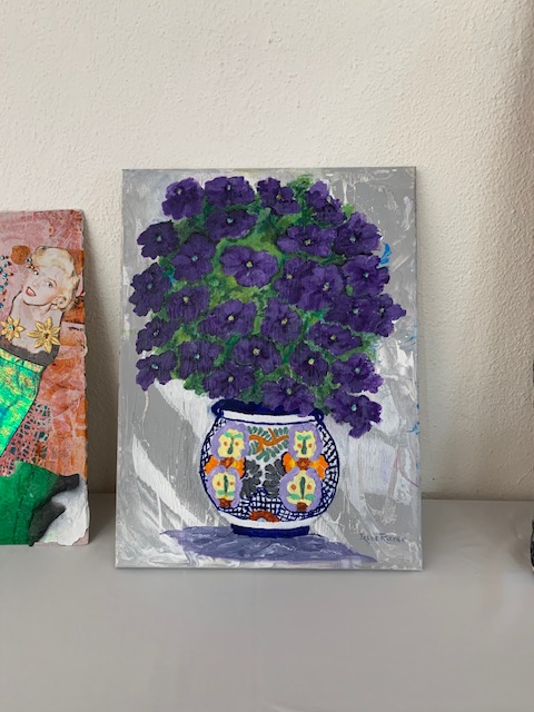 After we reviewed the collages from a couple weeks ago we had a few other pieces to see. Irene did this of the Petunias that sit on her porch. A few things were discussed about her painting, which the background btw was a paint pour she didn’t like, to help it be grounded and delineate the petunias a bit better. Irene said there was no light source so it was difficult to paint them with a light source direction. Great job Irene!