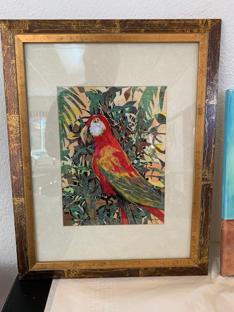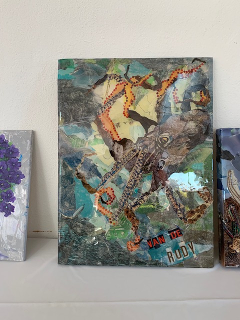 These are Kimmer’s collages. The octopus is what she worked on in December and the cactus was from a workshop we did with Constance last season. Kimmer faced some struggles with the octopus when she sealed it with resin, and finally concluded that the oil painting underneath was the culprit, as it took four resin pours before she got it to cure. Glad she was able to save this fabulous piece!