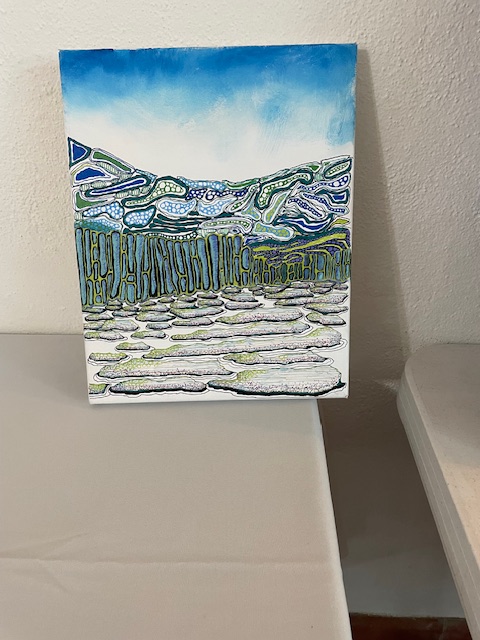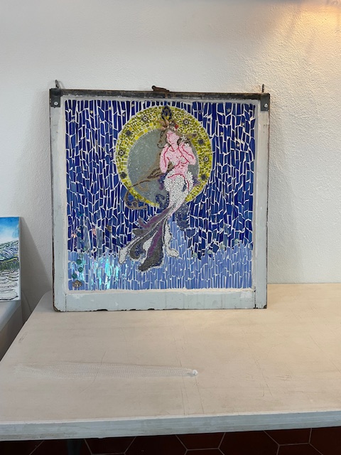 Kimmer was back from her mini-vacation and brought in a mosaic she did on an old glass window (glass, beads, crash glass, and other ornamentation) and a small painting done mostly with acrylic paint pens: