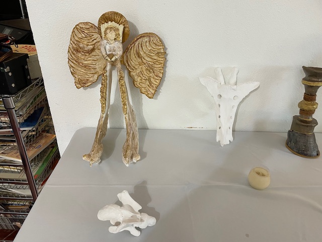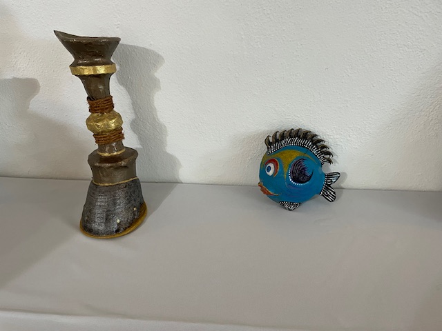 We did a bit of show and share. Mary brought a few of her found objects that she’s embellished with papier mache and/or other items, plus one of the dog faces she’s done: