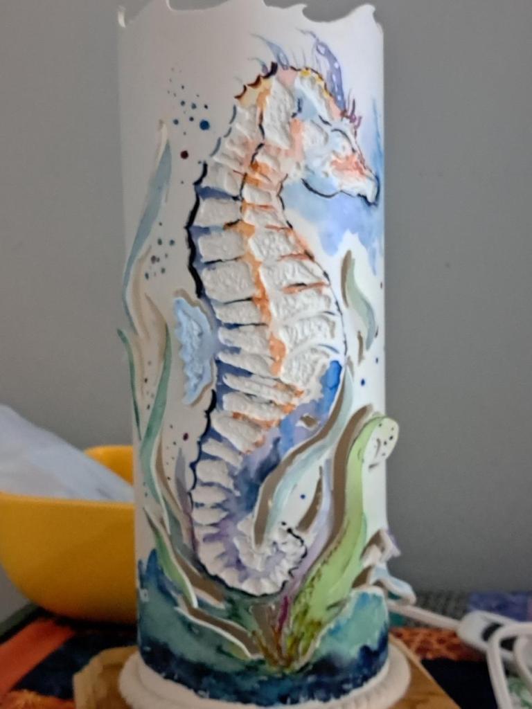 Terri has a commission to paint this carved PVC pipe lamp, lookin good so far! And her progress on her Chica!