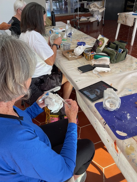 Ray working on a drawing since she finished Miss Piggy! Jody didn’t have a coconut base so was playing around with a flat piece. Jackie working on a landscape while her elephant dries more!