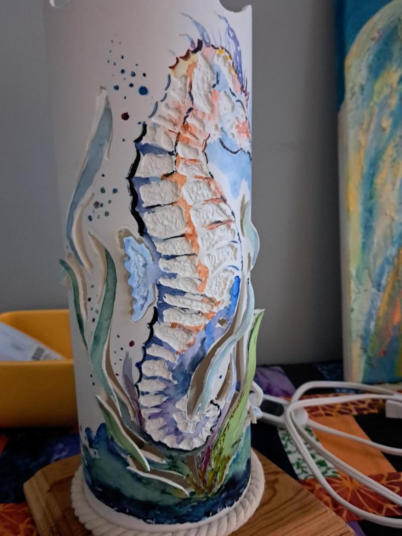 Terri has a commission to paint this carved PVC pipe lamp, lookin good so far! And her progress on her Chica!