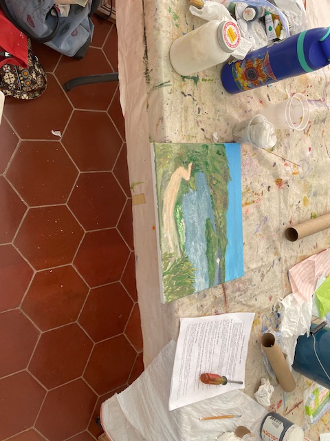 Ray working on a drawing since she finished Miss Piggy! Jody didn’t have a coconut base so was playing around with a flat piece. Jackie working on a landscape while her elephant dries more!