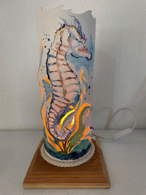 Top row, left to right: Claudia’s Shih Tzu, then Brenda’s Puffer Fish and Jan’s Cat. Middle row, left to right: Lisa’s Salsa dog in progress, and her finished Crab Fart’s piece, and Terri’s completed PVC lamp that everyone but the person she is doing it for has seen! Finally the last photo is Olivia’s rooster with feathers!