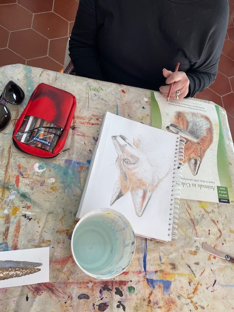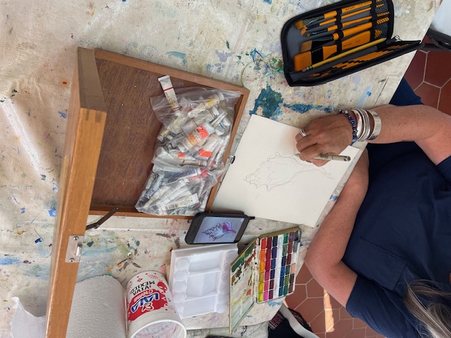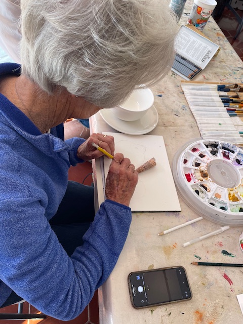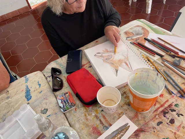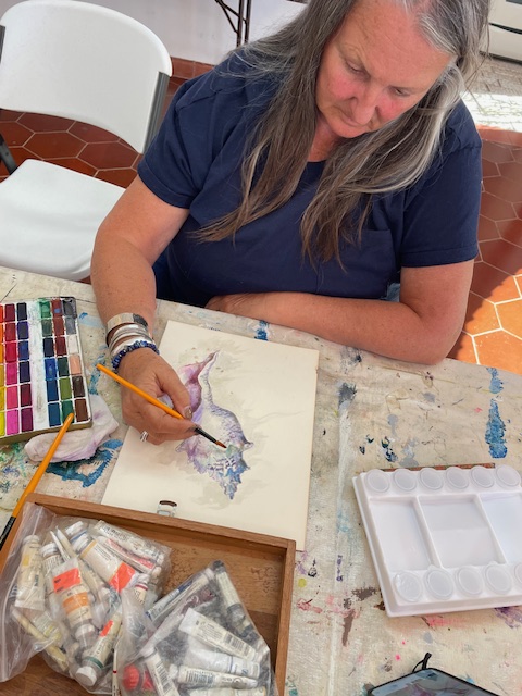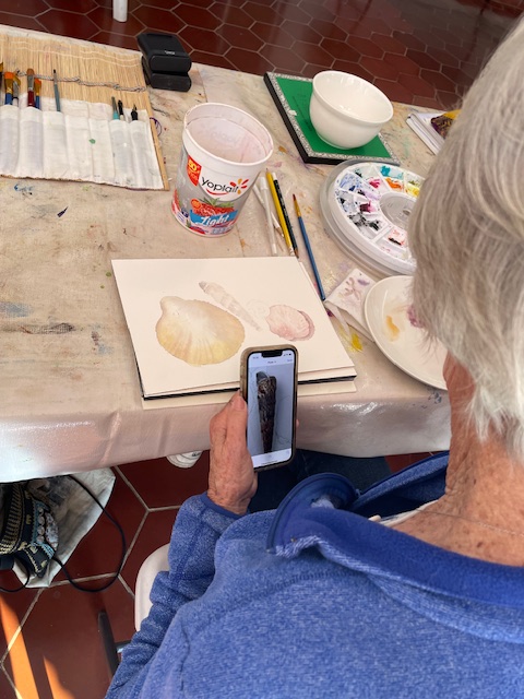 Today we had a special guest do a Watercolor session with us, Jody Rigsby. Terri met Jody a few years ago when Jody and her husband stayed at their yard in New Mexico to “house sit” one winter. Jody has been coming to San Carlos for a couple of years now and offered to do a WC class for us. Jody led us through painting shells. Her technique is a little different in that she doesn’t flow color on but rather dabs color on and many layers and brings in other colors that you wouldn’t normally think of to add contrast and make things pop.