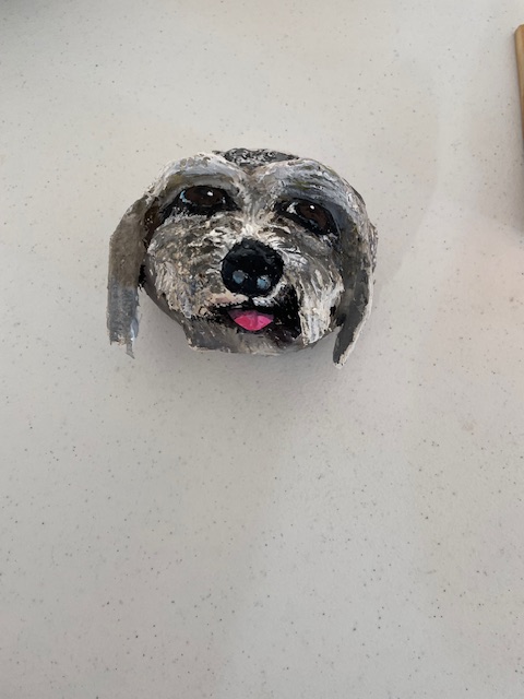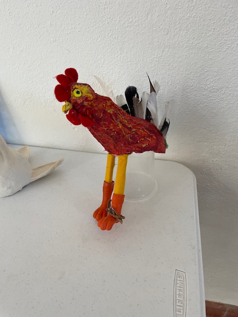 Top row, left to right: Claudia’s Shih Tzu, then Brenda’s Puffer Fish and Jan’s Cat. Middle row, left to right: Lisa’s Salsa dog in progress, and her finished Crab Fart’s piece, and Terri’s completed PVC lamp that everyone but the person she is doing it for has seen! Finally the last photo is Olivia’s rooster with feathers!