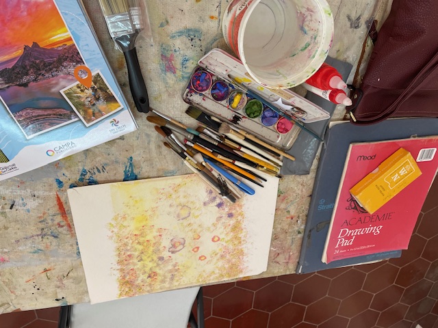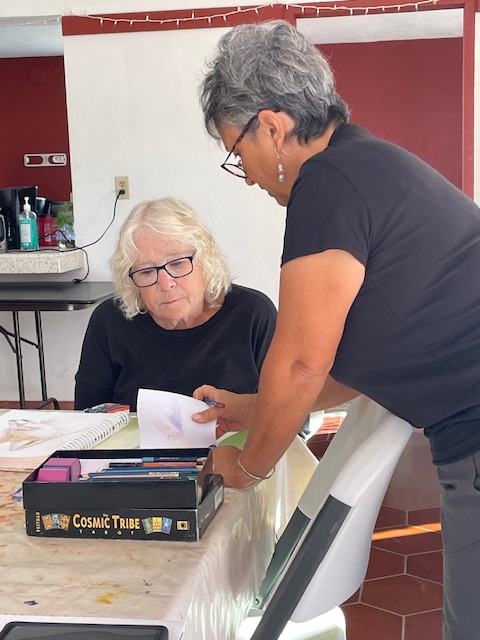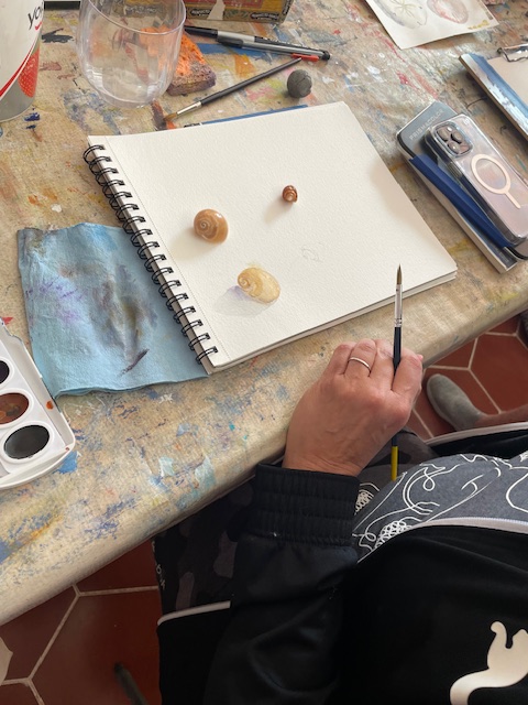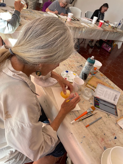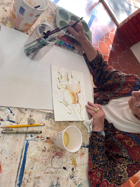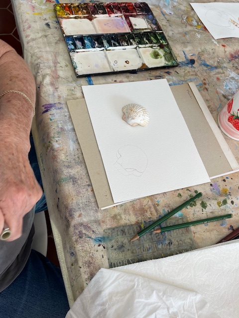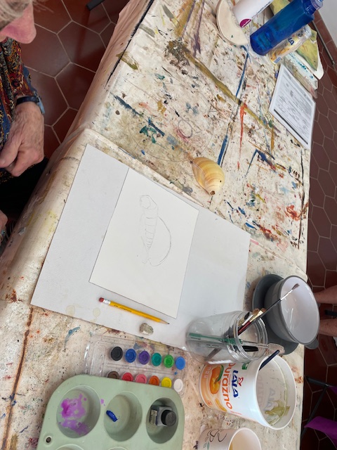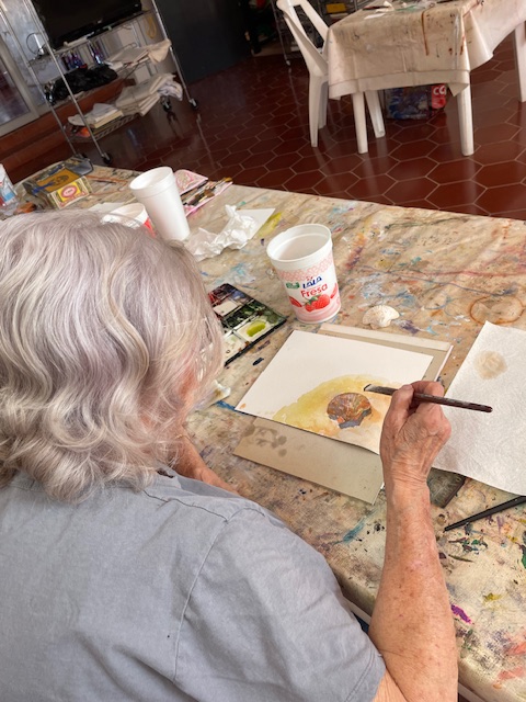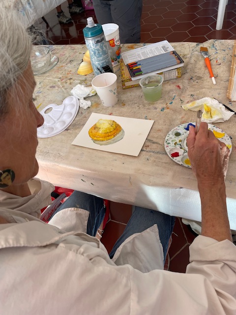 Today we had a special guest do a Watercolor session with us, Jody Rigsby. Terri met Jody a few years ago when Jody and her husband stayed at their yard in New Mexico to “house sit” one winter. Jody has been coming to San Carlos for a couple of years now and offered to do a WC class for us. Jody led us through painting shells. Her technique is a little different in that she doesn’t flow color on but rather dabs color on and many layers and brings in other colors that you wouldn’t normally think of to add contrast and make things pop.