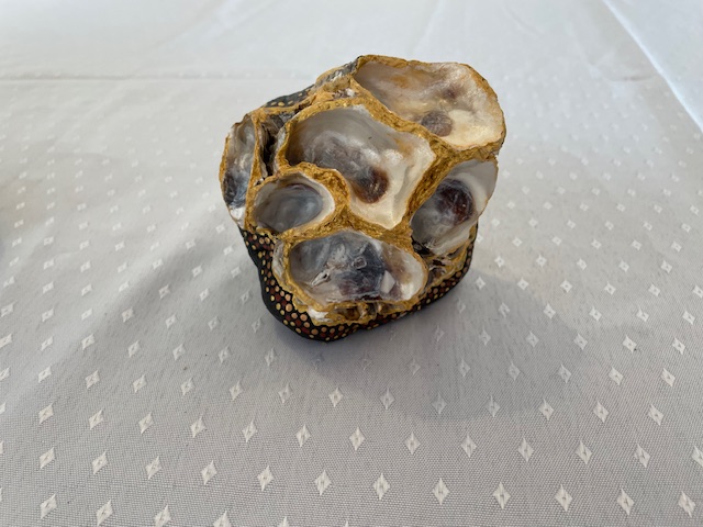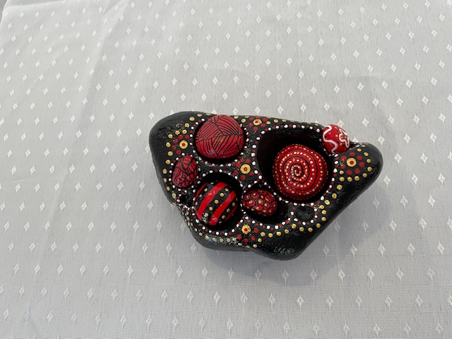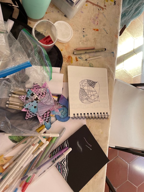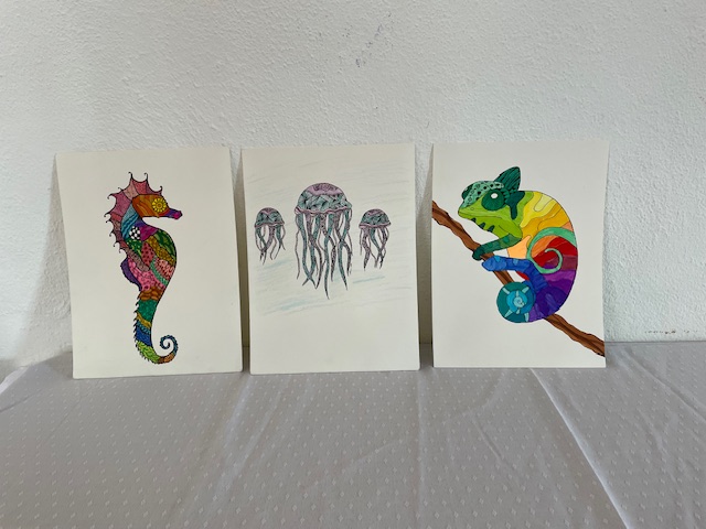 Mary was away on vacation for a couple weeks, but took some supplies with her and she did these amazing rocks! The left one is a conglomerate rock with Oyster shells grown into it, that she enhanced with paint and mandala dotting. The red and black rock had many holes in it that Mary said just screamed little rocks in them, and she embellished them all with paint and mandala dotting. The three Zentangles in the right photo are some that Lisa has done, which are destined for her granddaughter’s walls.