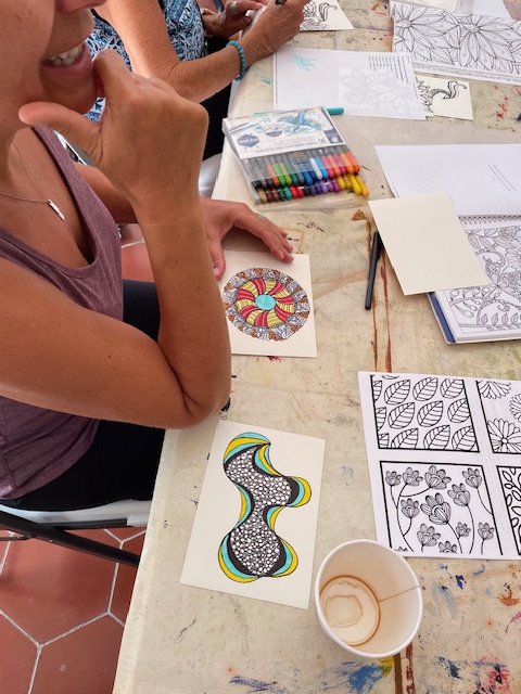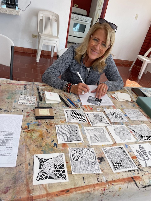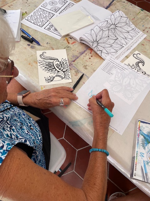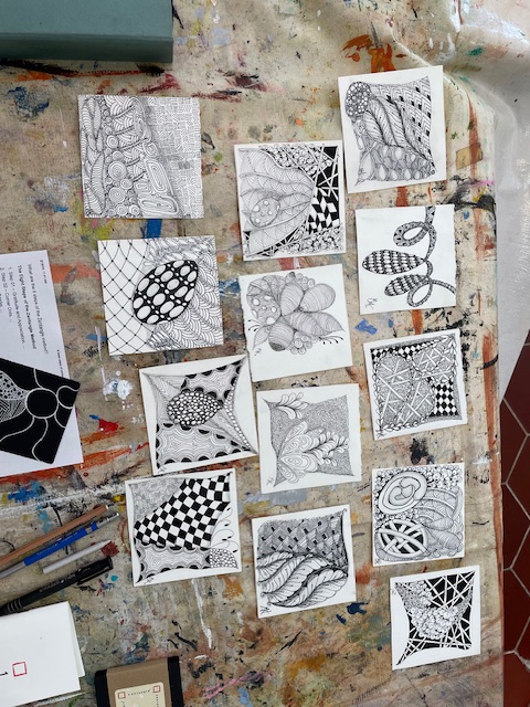 With a few books and the video we all started creating and learning some of the steps. Mary also has done a fair bit of Zentangle work, as has Lisa, so we showed some of what we have done as well. Everyone enjoyed this open studio day, although Terri didn’t really get time to try her hand at it. Hopefully next season Vicki, a Certified Zentangle Artist, may be back and can do a full session with us! Here are some photos and comments for you to enjoy: