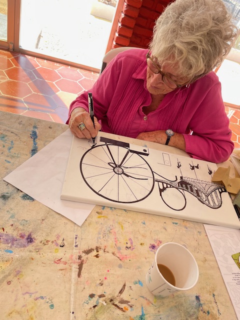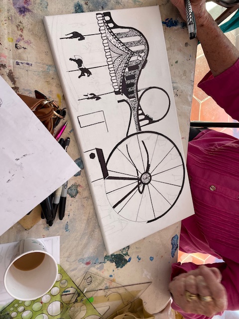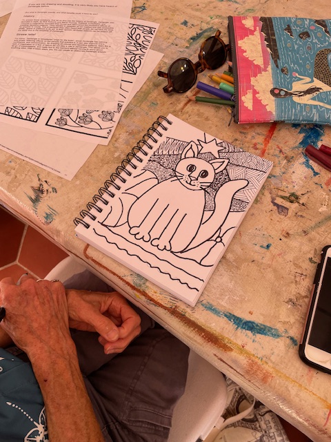 On the left are some of Mary’s Zentangle tiles that she’s done and made notes on the back, she’s hoping to eventually frame them as a collection. The middle photo with the Ferris Wheel, Roller Coaster and Carousel, is by Ray that she started in preparation for this session. On the right is an adorable Kitty that Lynn’s sister, Jennifer, started. You’ll see some more progression on her piece further down this page.