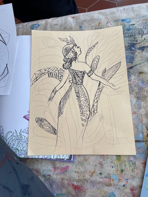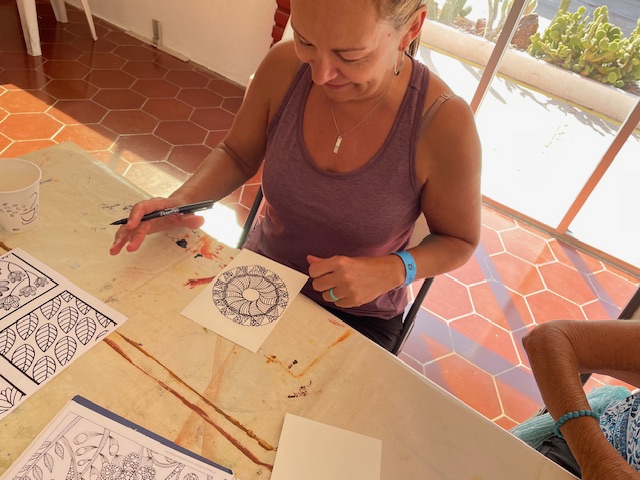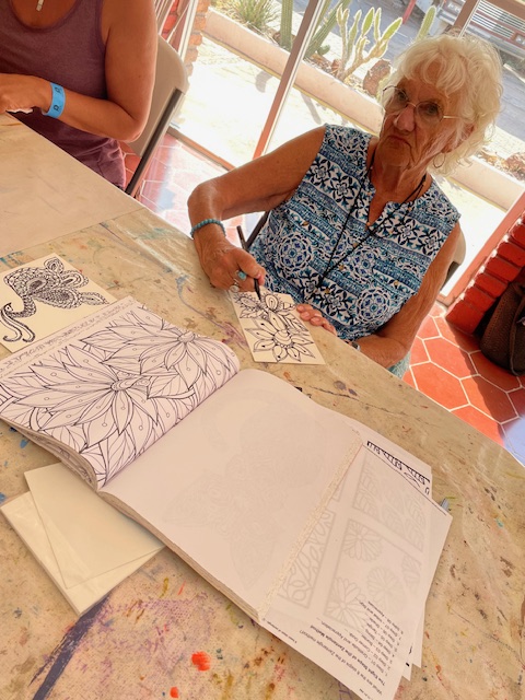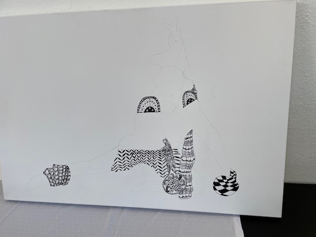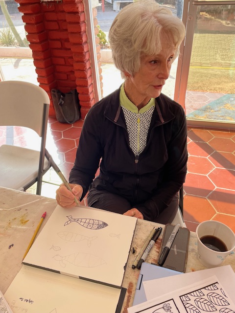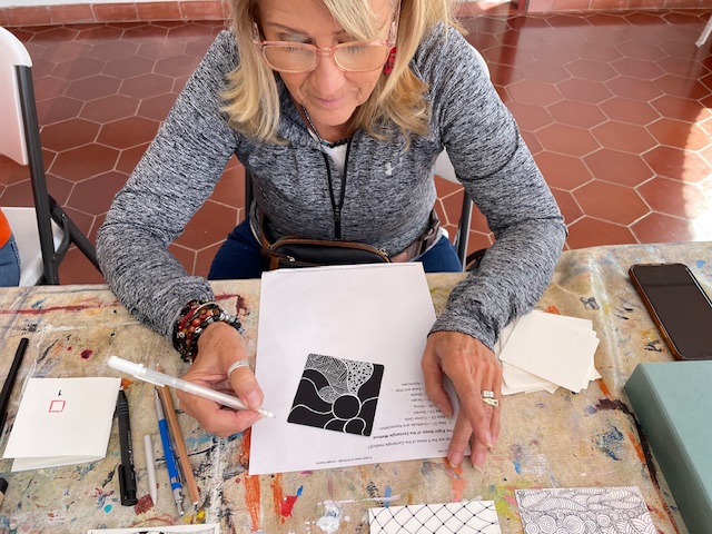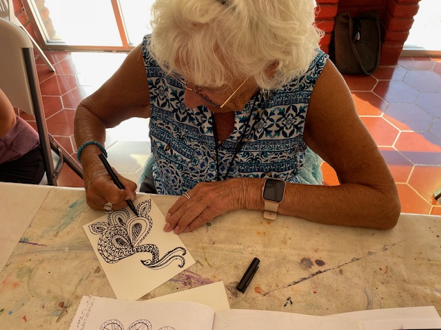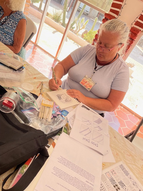 Kimmer arrived and talked about her Zentangle journey. This is a Yaqui Deer Dancer in progress to go with the one she brought last week. You can see her faint pencil lines for the basic shape and then she’s started to infill with Zentangle designs. Can’t wait to see it finished! Kimmer also brought her life-long friend, Robin, who is visiting her. She is an artist as well and had a career as a Graphic Artist to our meeting. It was so nice to meet all of our guests today, Robin, Jennifer and Denise!