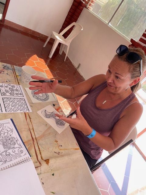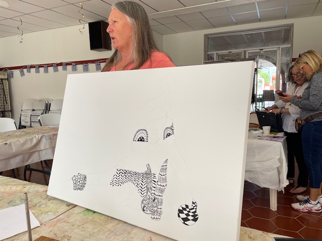 Then we watched a short video about starting to Zentangle and then jumped right in! Kimmer had an appointment but came after that and talked about her journey with Zentangle and how she started out with a journal, pen and just doing something every day and learning patterns. Her acrylic paintings often have some Zentangle elements in them and they add depth and interest to areas that may otherwise go unnoticed.