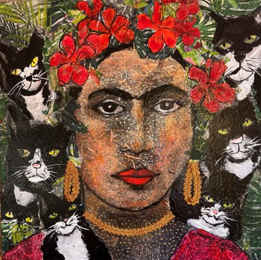 Elaine chose to do a Frida with her cats with her collage and mixed media flare, great work!