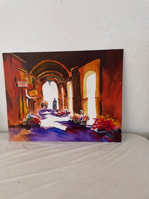 Terri brought in a recently finished piece done on canvas board with acrylic, watercolor and pen. The path of light is great, and the darks counterbalance the light perfectly, great job Terri!