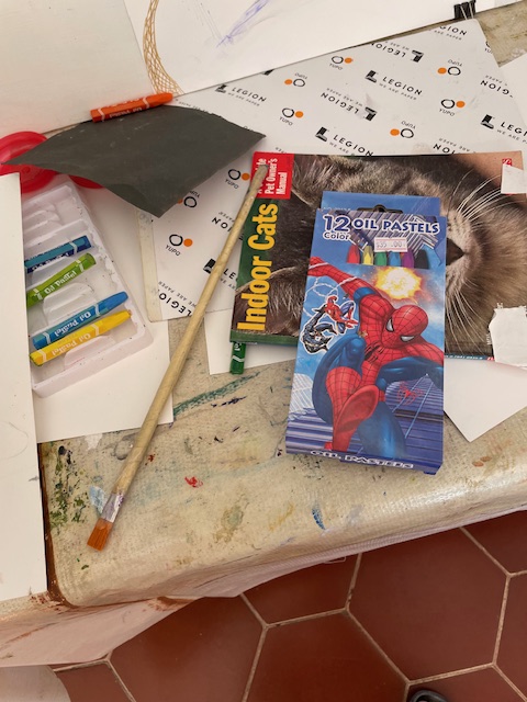 Olivia’s oil pastels are pictured in the Spiderman box, and she also uses a white grease pencil and some sharpies when working with the oil pastels. In the last photo you can see the cart, she basically just laid in three colours and blended until it looked like a loose arrangement of flowers in the cart. Never afraid to try things!