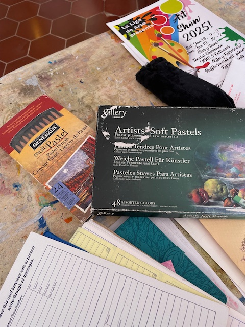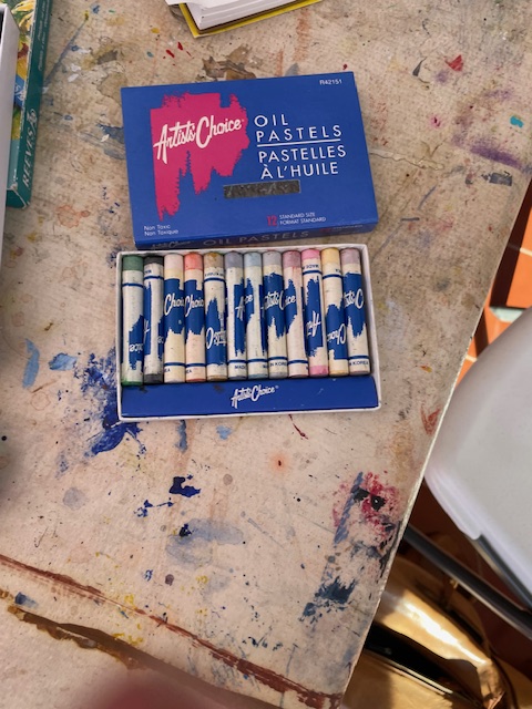 Doug brought his oil pastel sets to play with as well, one package he had to open, said he’s had them for years but never used them! We all have some supplies like that lurking in our stashes! He said that oil pastels do not completely dry so you must take care to ensure that you protect them with an overlay when transporting, and frame it with archival glass and ensure it is spaced away from the glass so it doesn’t make contact and potentially smear.
