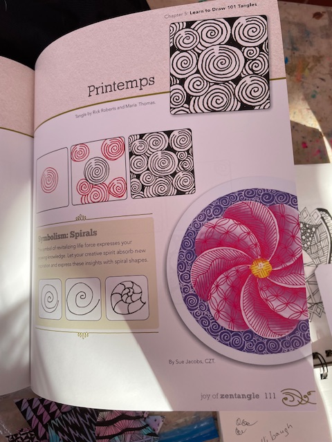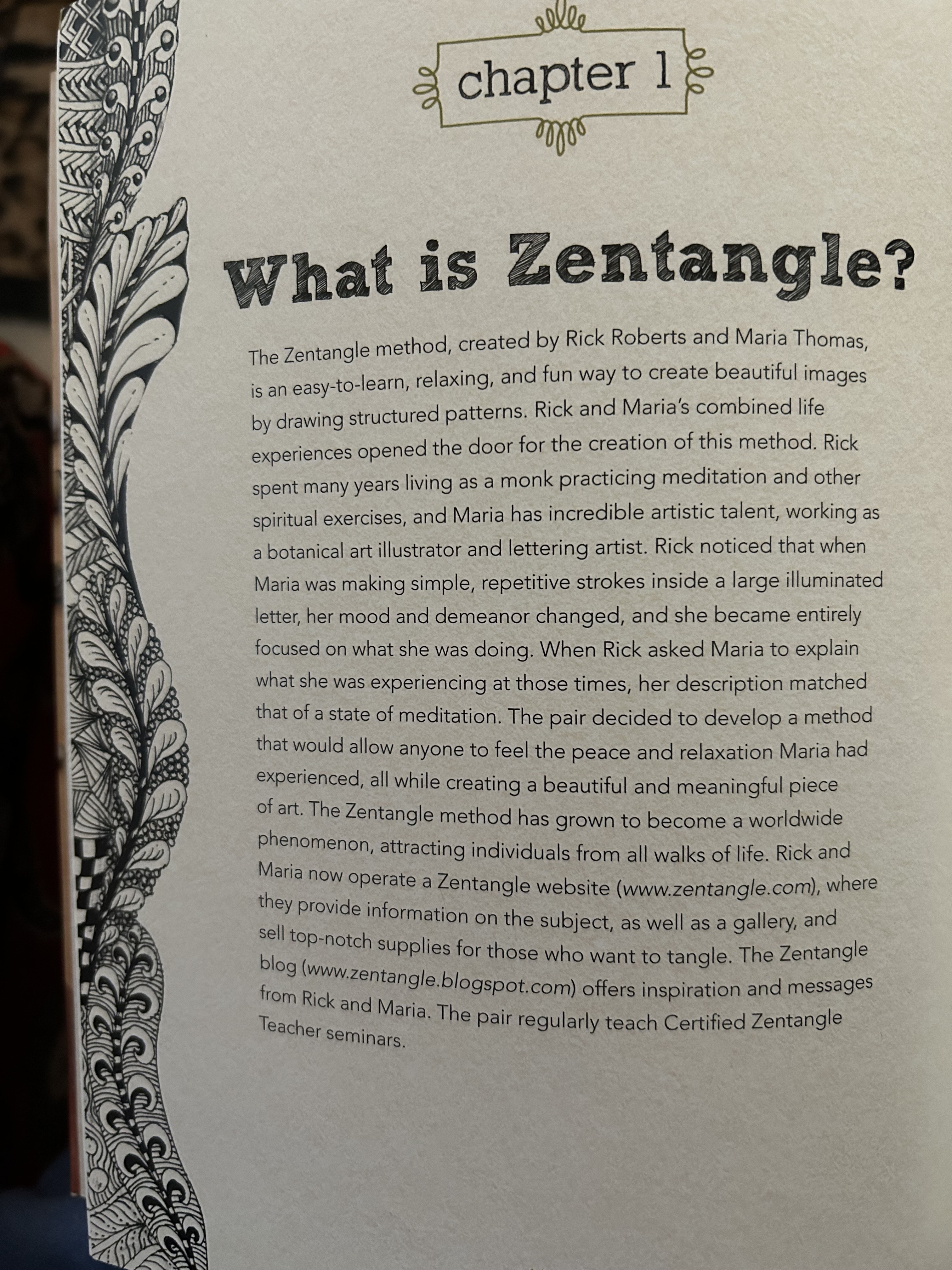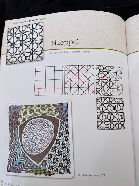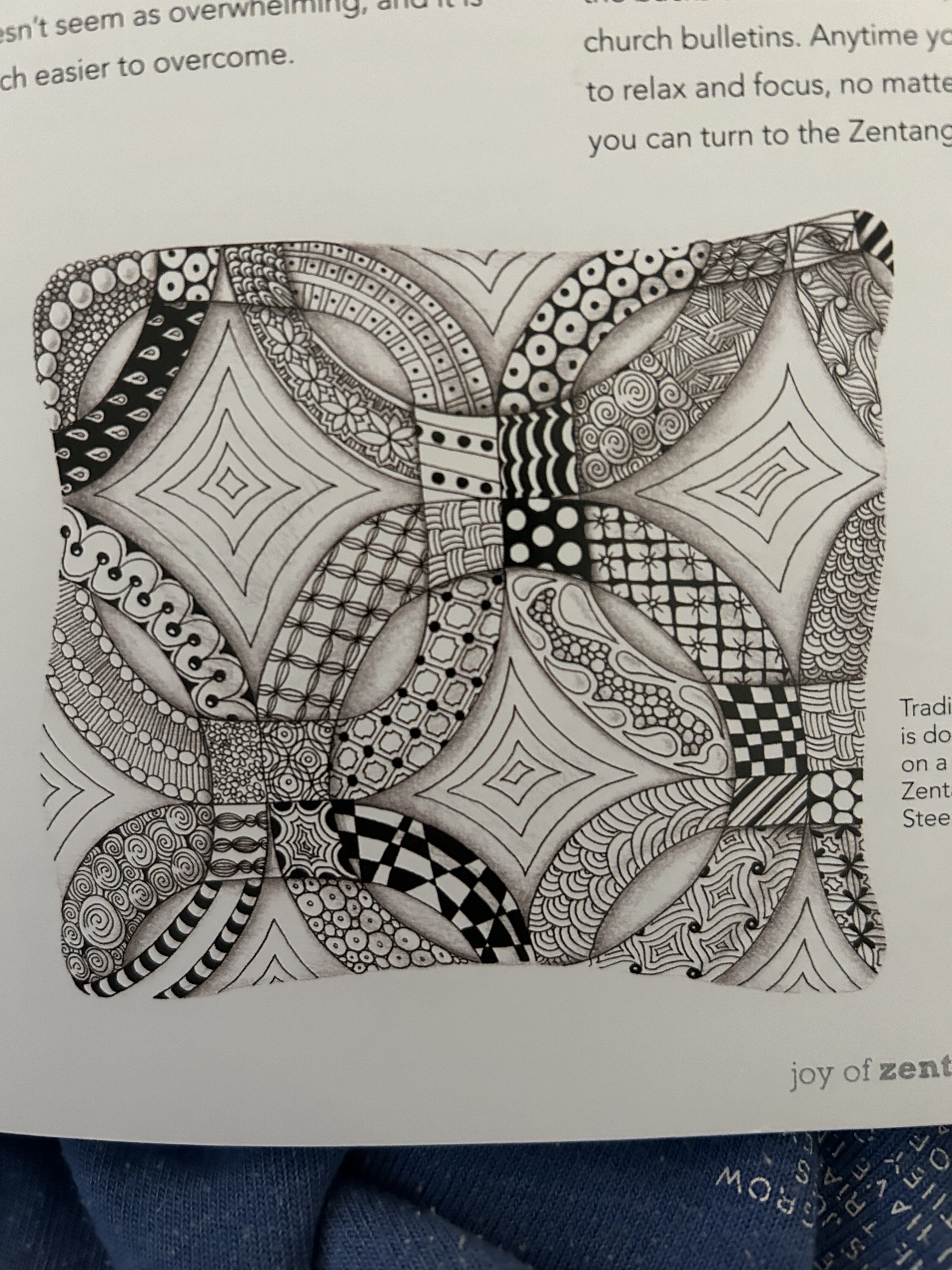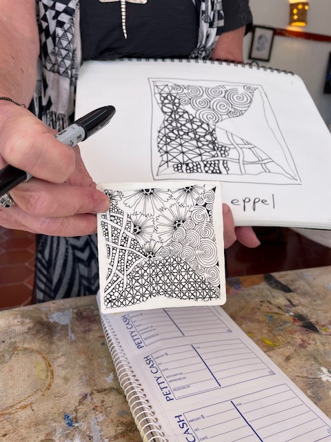 This book is a good starter book. Below are photos of the patterns that Vicki led us through, well, three of them, the fourth is another pattern, Henna Drum, that she loves that came from another source. The internet is full of Zentangle patterns, you can lose yourself for hours looking at all of them!