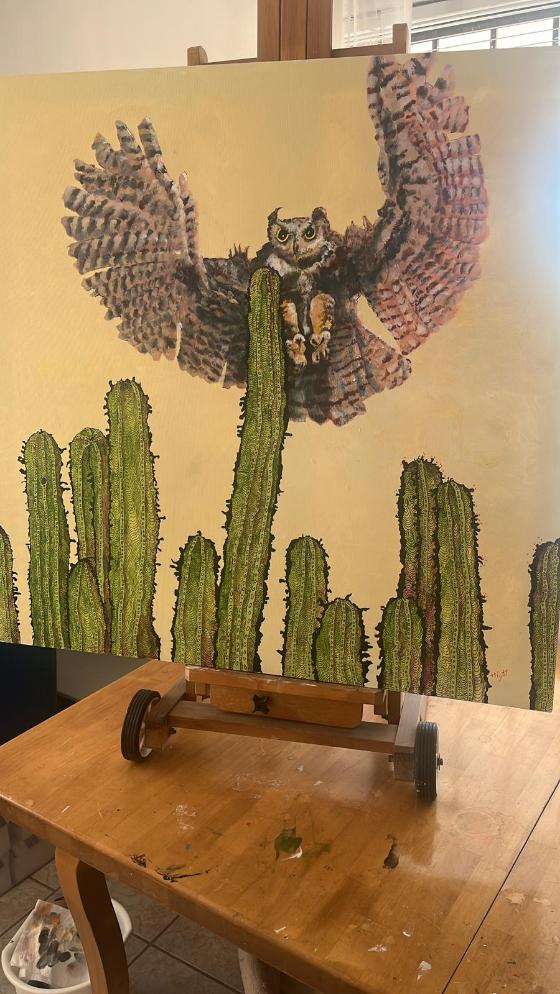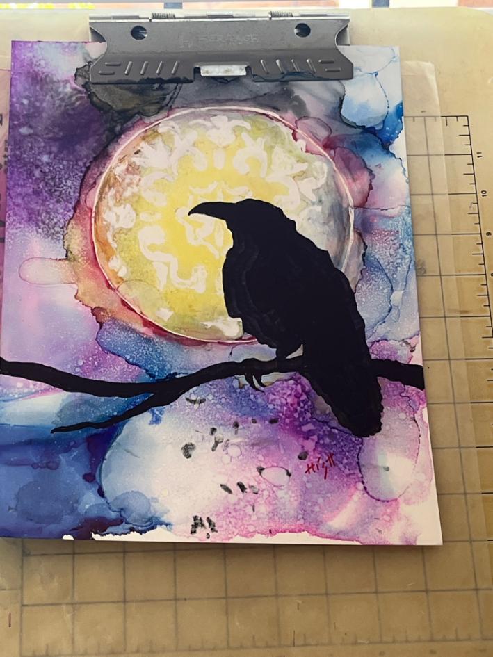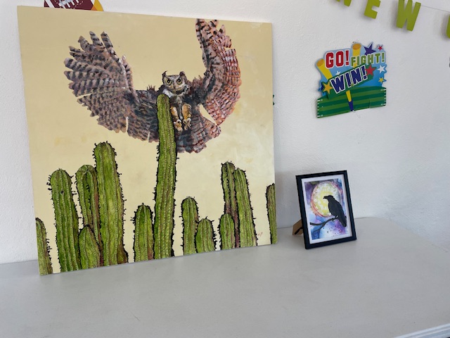 Owl with Zentangled Cacti in acrylic and pen, and Raven with Alcohol Ink background, both by Kimmer.