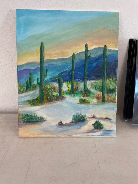 Brenda did this acrylic this week and wanted some advice. Discussion about grounding; perhaps a wash to tone down greenness; some more detail on the foremost Saguaros to bring them forward and give more depth; and other ideas were discussed. Looking forward to how Brenda incorporates these thoughts into her piece.