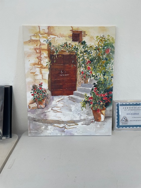 Terri brought in a watercolor that she did on canvas a while ago to show how you can adapt watercolor to other surfaces. She said it makes her crazy, but we say, good work!