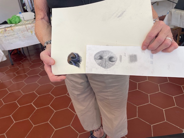 Wayne is learning how to use his pastel pencils, he is quite pleased with the vibrancy and detail he can achieve, although he said that you can’t fix mistakes with the pastel pencils like you can with colored pencils. The photo on the right is a nose with colored pencils and the left is pastel pencils, quite a difference! Looking forward to seeing Wayne develop his skills with this new to him medium!