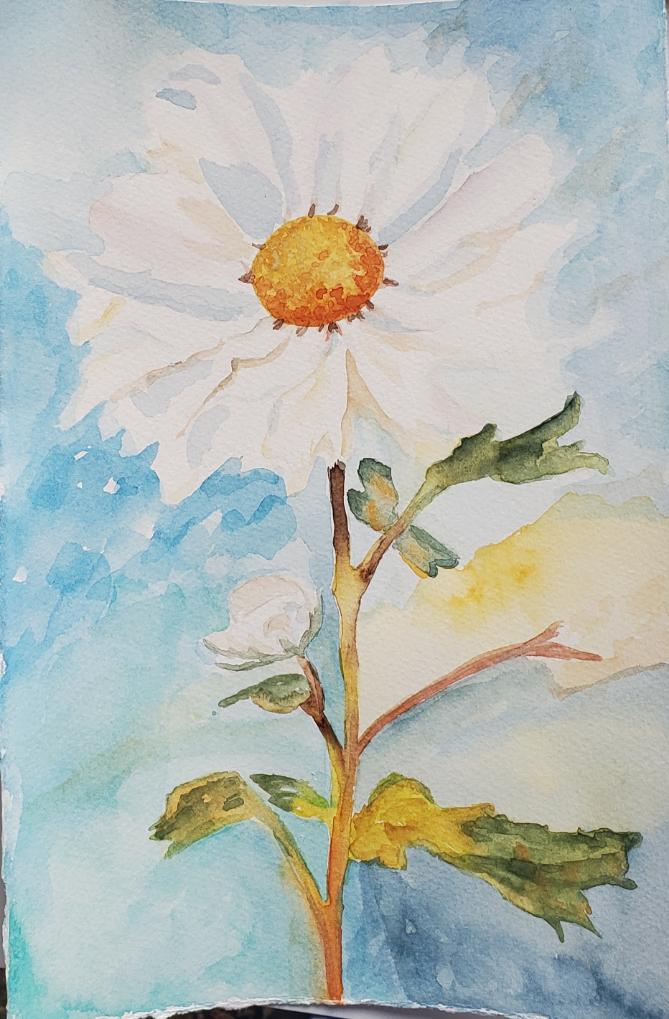 Julie sends her completed Daisy from our watercolor workshop. Soft and lovely! along with a quote by Claude Monet “I must have flowers always and always” love it!
