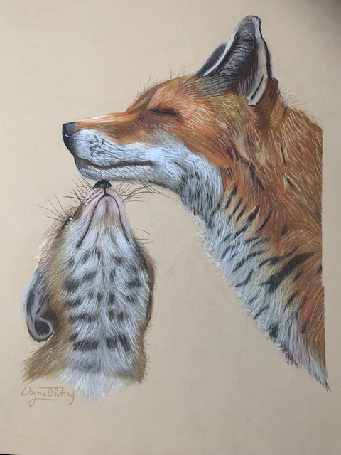 Wayne’s pastel pencil little foxes, ‘outside his window’ beautiful example of motherhood. Does Wayne sleep?