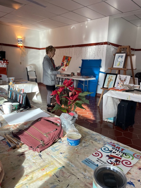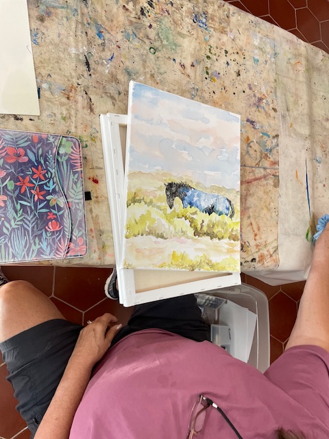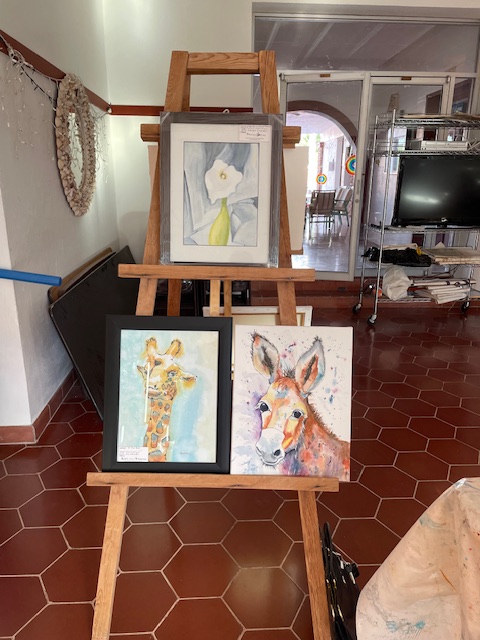 The top painting was Terri’s homework from a couple years ago when we emulated a Master, this was a Georgia O’Keefe Lily. This was done on a canvas board product without treating the board with watercolor ground. She talked about the issues with blending and how the paint reacts so differently on this type of surface. The Giraffe was done on canvas paper, he’s so cute! The donkey was done on a stretched canvas that she treated with watercolour ground.