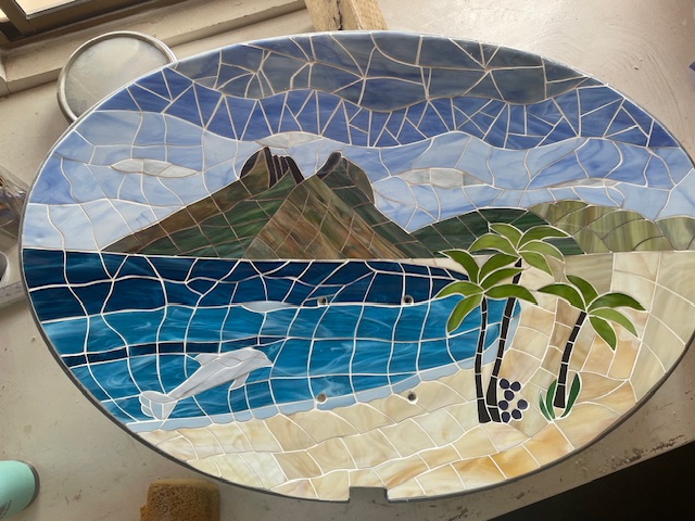Lisa didn’t bring her summer homework in because it is already mounted into their outdoor kitchen area at her home in San Carlos. This is partly her view from her studio windows and partly the view when they’re at the beach watching dolphins!