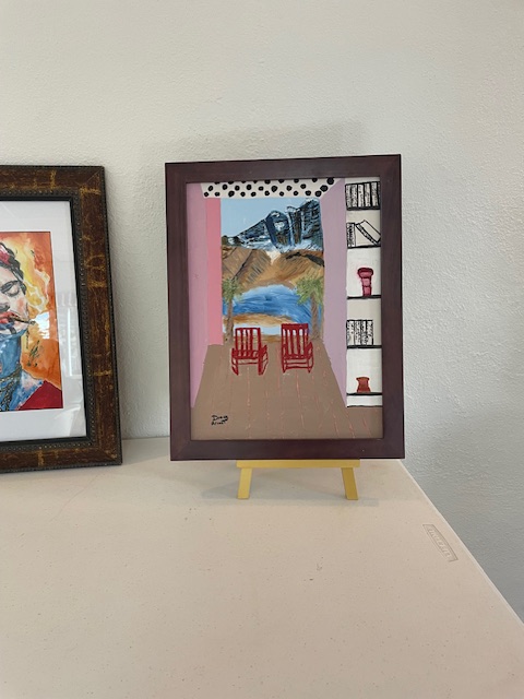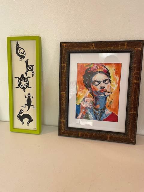 The Frida painting was Terri’s summer homework from the previous summer that made its way into Kimmer’s collection. Kimmer brought it in to show the cool frame that she found for the piece that not only accentuates the Frida but also with the decor theme in her home here in San Carlos.