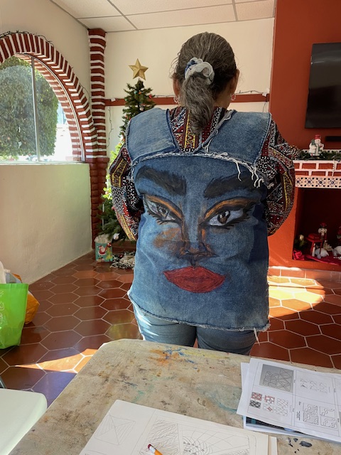Olivia had worn this jean vest that she made from reclaimed jeans and then painted on the back. Olivia does amazing eyes!
