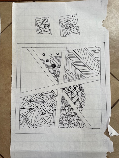 Then for “fun” afterwards Lisa demonstrated and we worked on another Zentangle – the main grid is Hollibaugh, then infilled with Papyrus, a variation of Beelight, Keeko, Asian Fans and Nipa, inside the Hollibaugh sections: