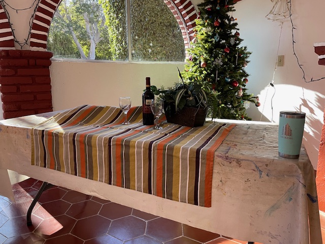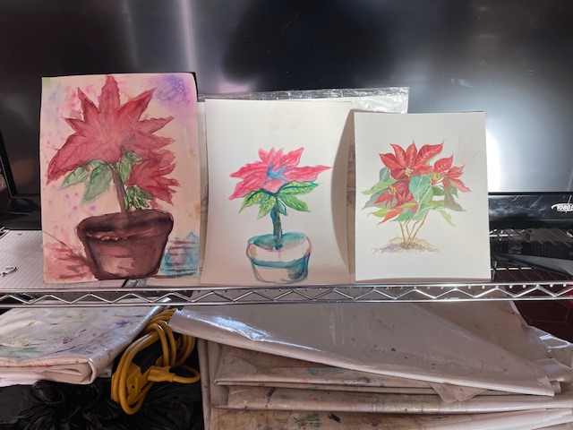 Before we began we had a bit of a business meeting to discuss January’s show, and we also had a few of last weeks’ Pointsettias (the left two are by Olivia and the right one is Lynn’s) to enjoy and Lynn brought a piece that was painted all with Wine! (sorry for the glare, the wine painting is in a sleeve and it was difficult to get a goodish shot…)
