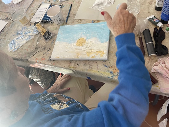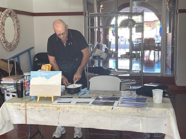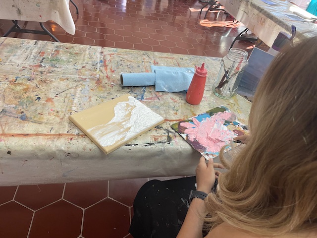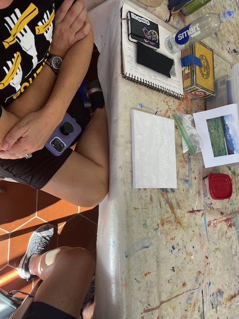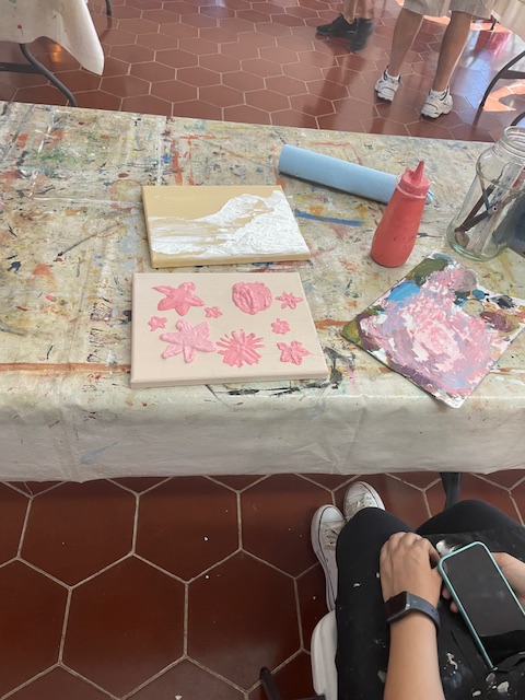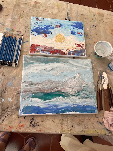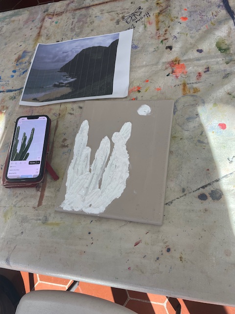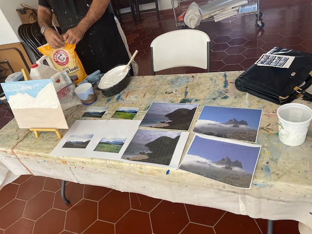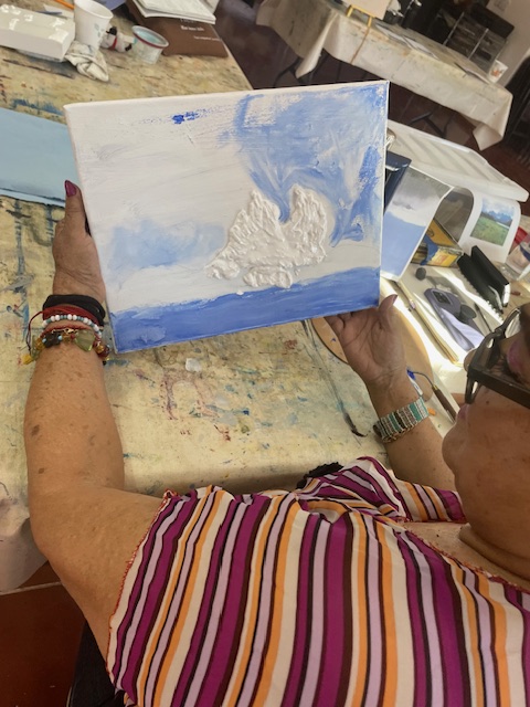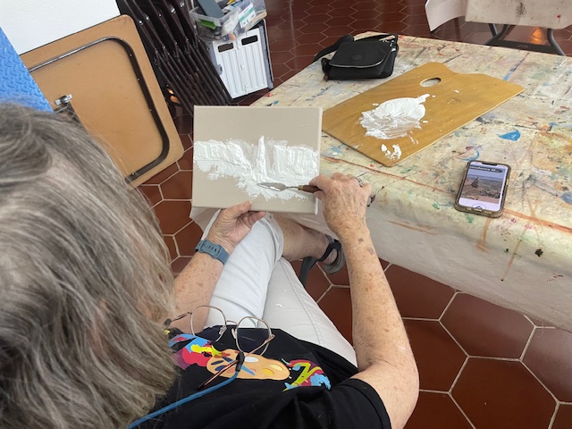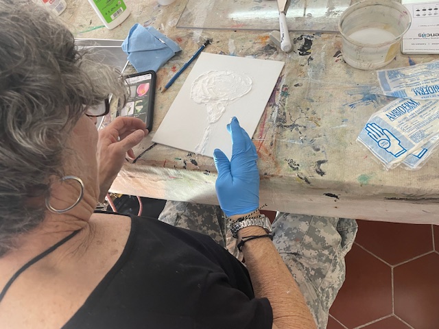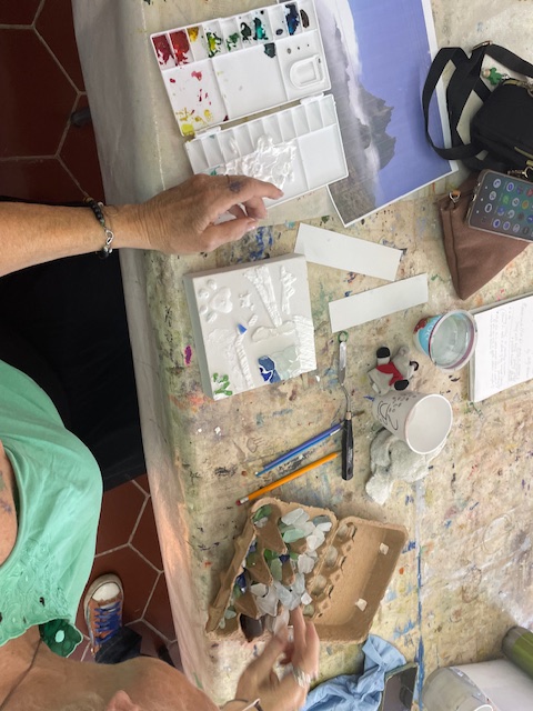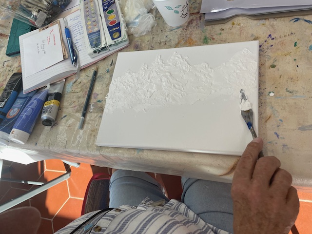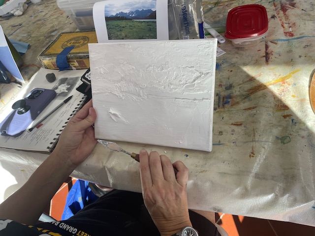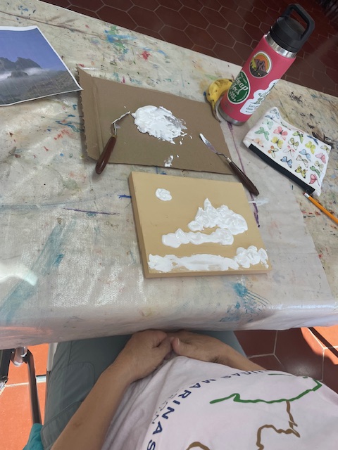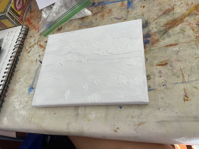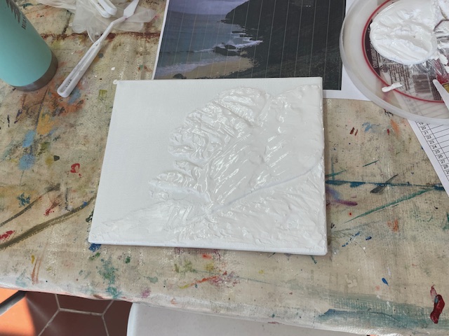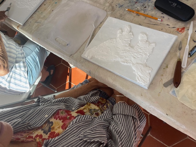 Doug prepared the air dry clay using baking soda, white glue, white acrylic paint and water to loosen it up to a workable consistency. We worked on canvasses, many of them he’d painted over and we reused them or brought our own blank canvasses.