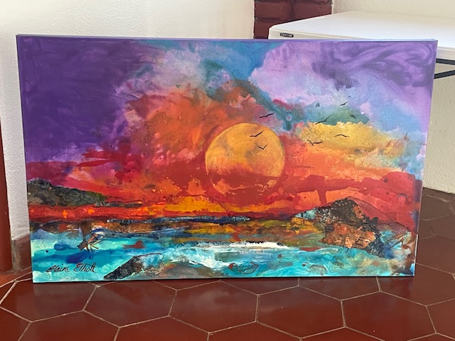 Elaine brought this painting in for us to see before the new owners come to pick it up. It is a combination of acrylic paint and collage. It is about 48″ wide and about 30″ tall. Again Elaine’s combination of media has resulted in a terrific piece! It will be well-enjoyed in its new home!