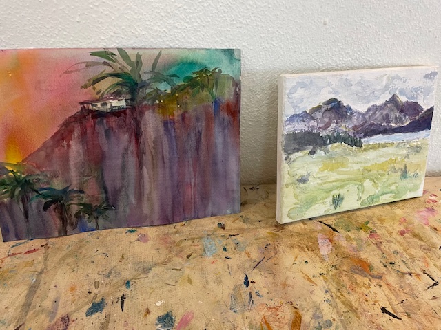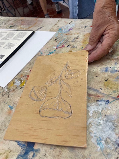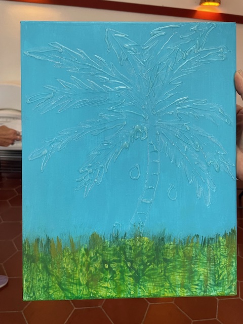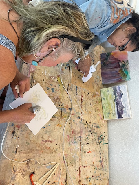 On the left is Karen using Granulation in a wash to create the flow effect. She said that it is difficult to not wash off your cool granulation while getting it to flow. Turned out really cool! On the right, Kim brought in the relief that she did during Doug’s glue and baking soda relief class. She was looking for input as she feels it isn’t done yet, but we all thought it was great!