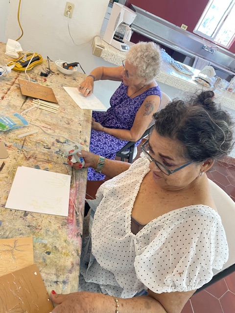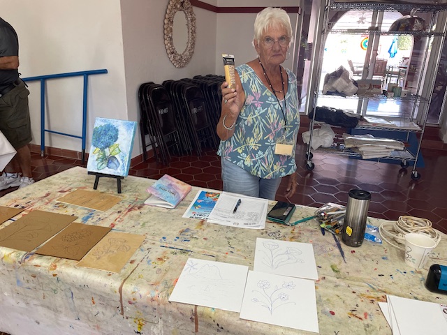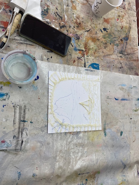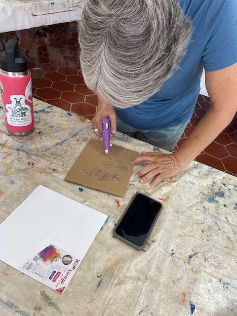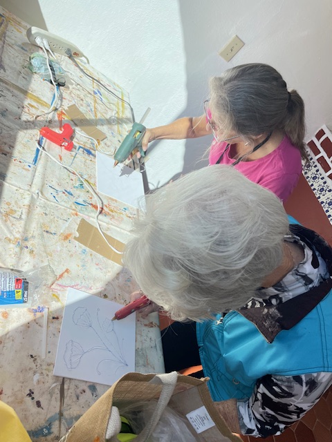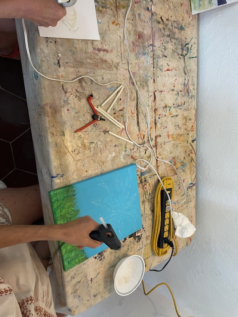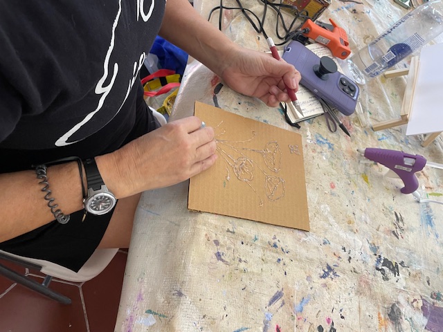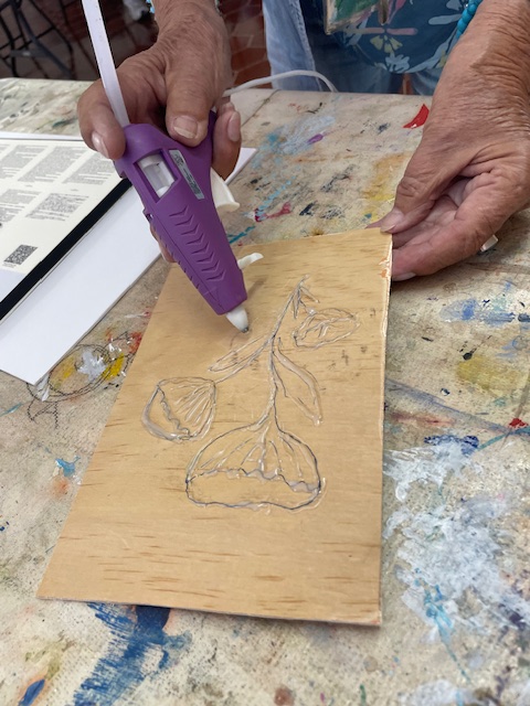 Today Brenda did a glue gun demo to provide texture and interest on a piece prior to painting. She came prepared with some pre-drawn boards and some cardboard for those that wanted to practice first, and we just went to town!